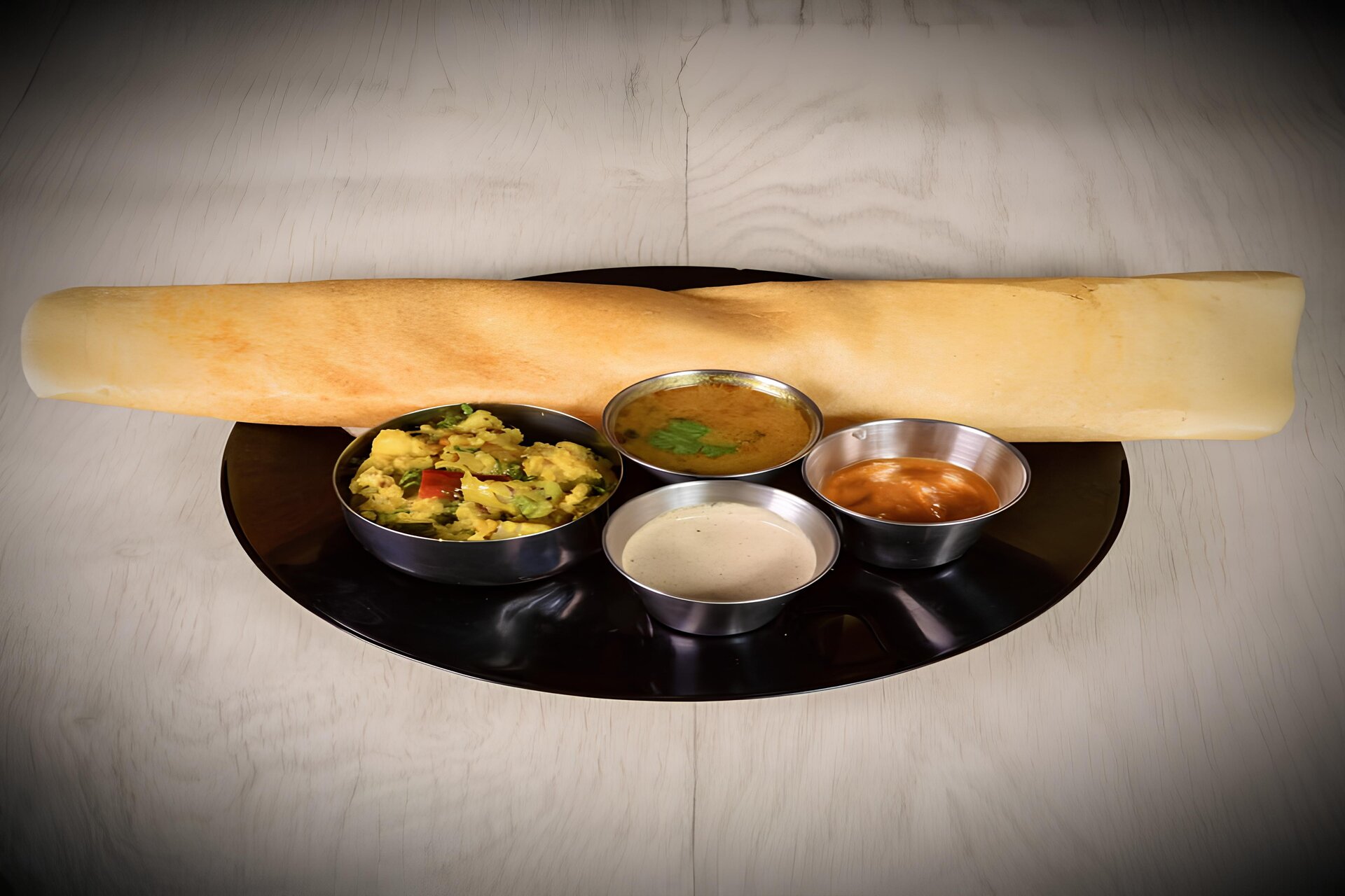 The golden, crisp dosa offers a perfect crunch, its outer layers light and delicate. Paired with bowls of vibrant chutneys, each bite brings a burst of tangy, spicy, and savory flavors.